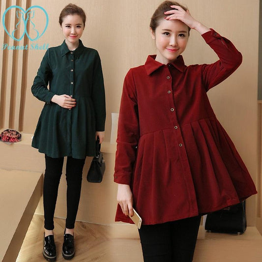 Amazing Pleated Waist Button Corduroy Maternity Blouses - Fashion Pregnancy Tunic Tops - Clothes For Pregnant Women (D4)(Z1)