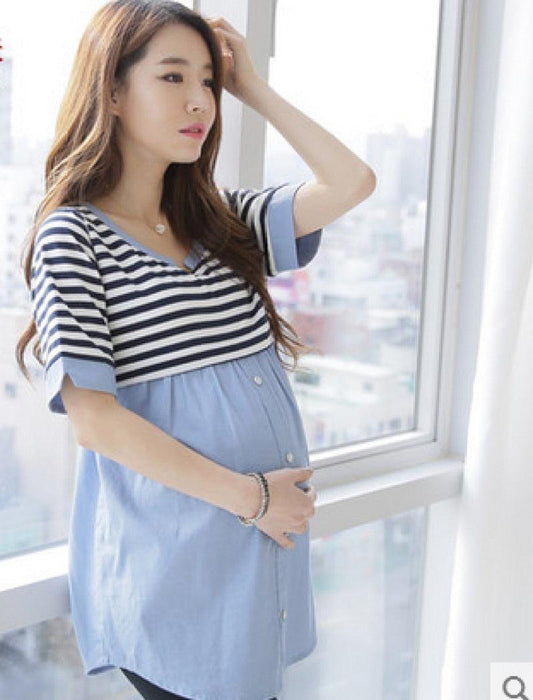 Gorgeous Summer Thin Strip Patchwork Maternity Nursing Blouses - Ties Waist Slim Breastfeeding Shirt for Pregnant Women (Z1)