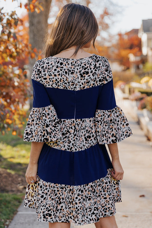 Animal Print Color Block V-Neck Flounce Sleeve Blouse