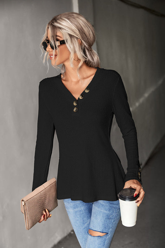 Waffle-Knit Button Detail V-Neck Top