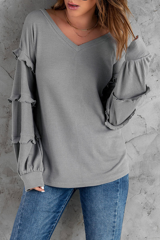 Waffle Knit Ruffle Trim Top