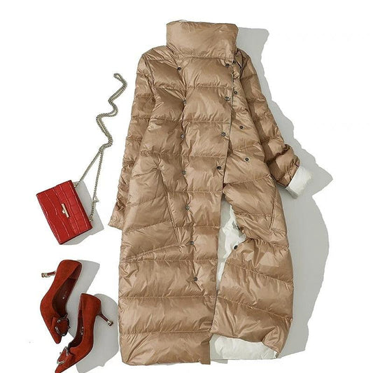Women Double Sided Down Long Jacket - Winter Turtleneck White Duck Down Coat - Double Breasted Warm Snow Outwear (TB8A)