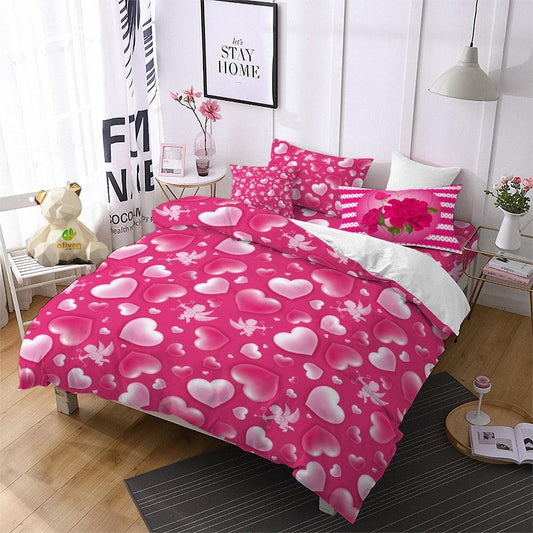Red Pink Heart Bedding Set Rose Cupid Print Duvet Cover Set Girls Romantic Bedding Cover (8BM)(F63)