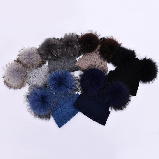 Gorgeous Fur Pompom Hat - Women Winter Beanies - Female Two Fur Beanie Hat