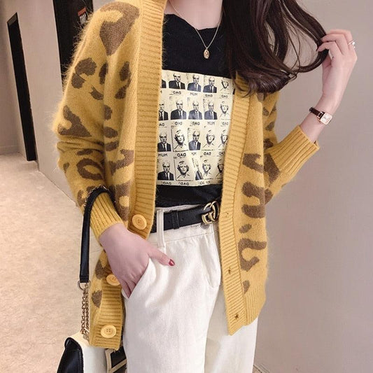 Elegant Cozy Knitting Cardigan - Women Leopard Sweater - Female Oversized Cardigan