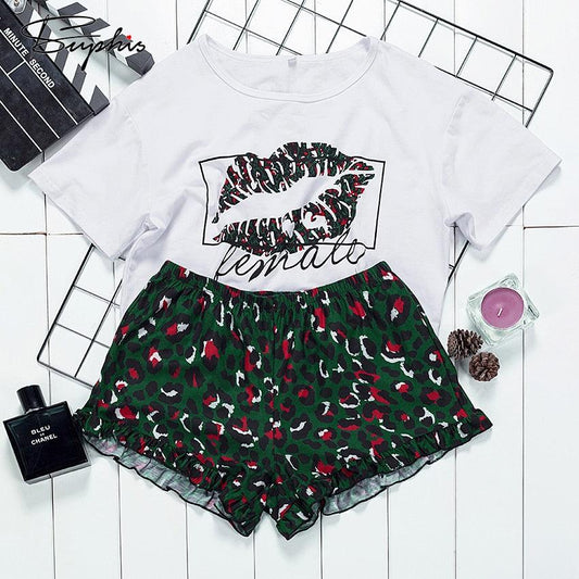 Cute Summer Sexy Lips Print Crop Top White Women T Shirt & Short Pajama Set - Ladies Casual Sleepwear