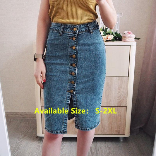 Trending Spring Summer New Denim Sheath Wrap Skirts - Single Breasted High Waist Pencil Midi Skirt - Front Split Skirts