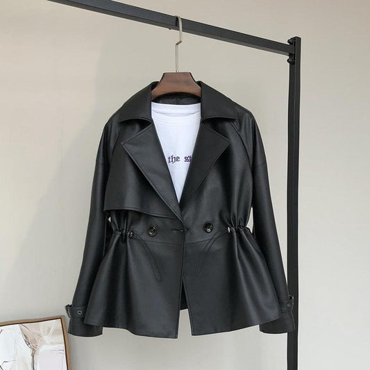 Beautiful Autumn Women Leather Jacket - Turndown Collar Loose Streetwear Black Outerwear (TB8B)