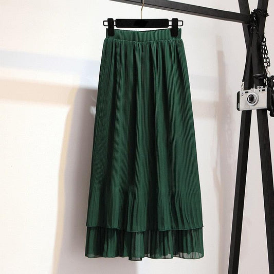 Spring Women Chiffon Skirt - Vintage Double Ruffle A Line Long Skirts - Elegant High Waist Pleated Skirts