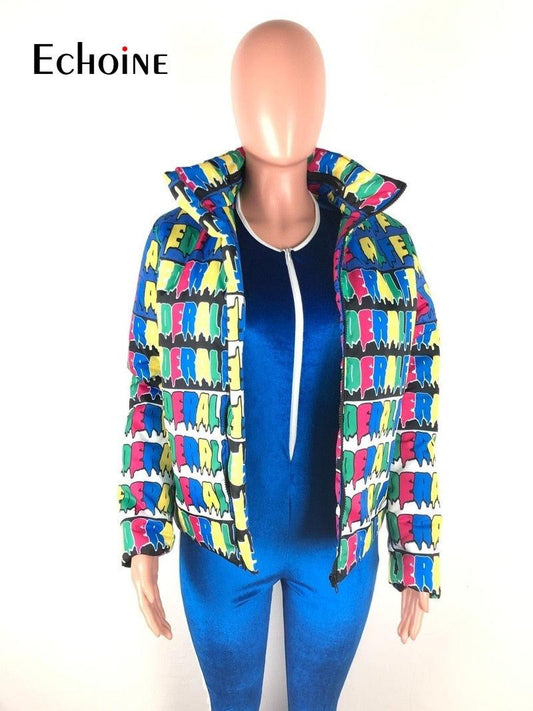 Fashion Letter Print Winter Down Jacket - Women Festival Warm Parka Bubble Coat Top - Warm Thick Stripe Outwear (3U23)