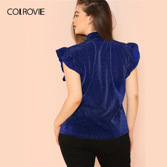 Trending Plus Size Blue Tie Neck Ruffle Armhole Glitter Top