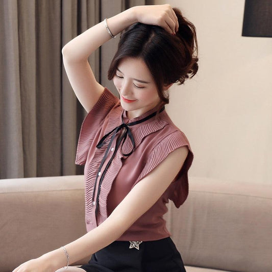 Great Summer Tops Short Sleeve Women Chiffon Blouse Elegant Bow Tie Ruffles Casual Shirt Tb1tb2