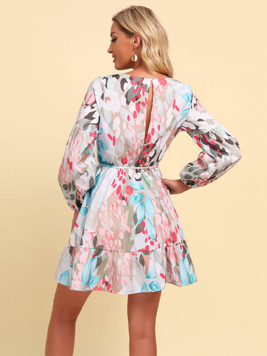 Printed Tie-Waist Puff Sleeve Surplice Dress