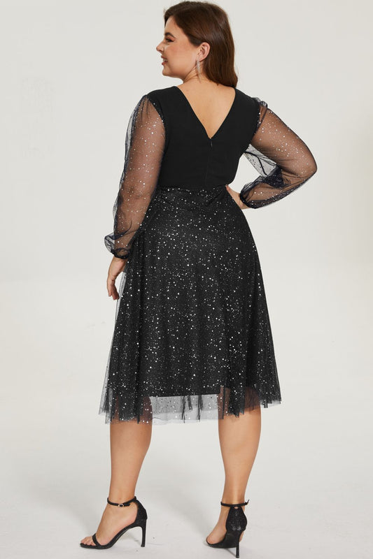Plus Size Glitter Mesh Sleeve Plunge Dress
