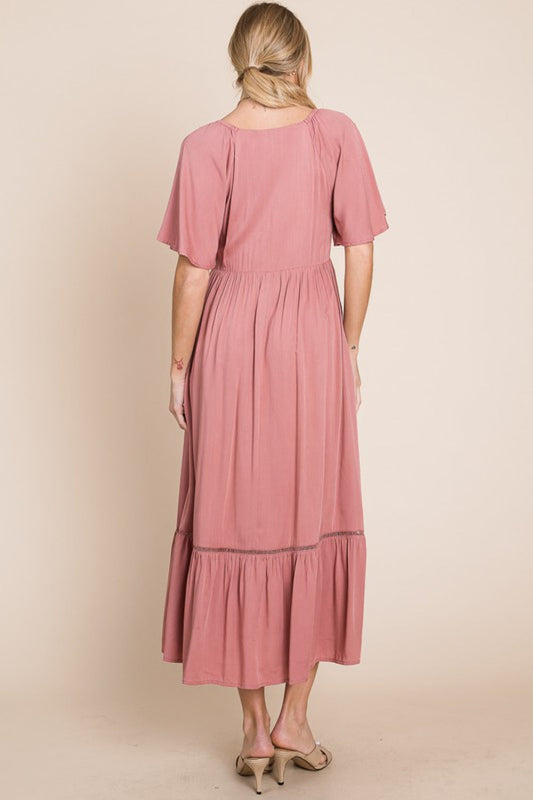 Buttoned V-Neck Flutter Sleeve Pleated Dress
