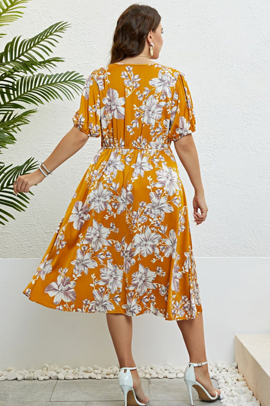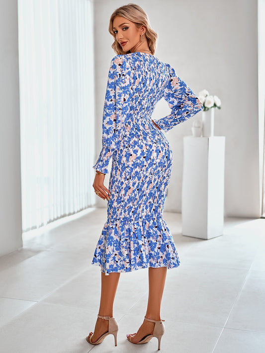 Floral Surplice Lantern Sleeve Fishtail Dress