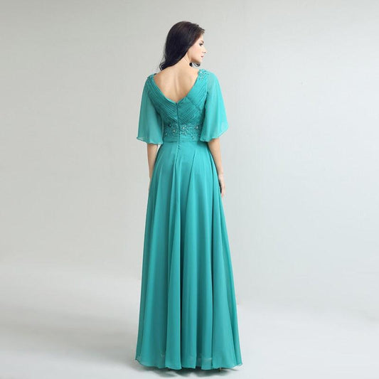 Elegant Half Sleeve Jade Long Dress - Beading Chiffon Pleated Top - V Neck Fashion Women Party Gowns (BWM)(WSO3)(BCD1)(F30)(F35)