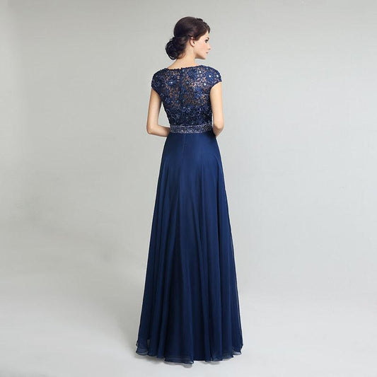 Gorgeous New Navy Blue Cap Sleeve Dress - Beading Sashes Chiffon Pleat Back Lace Formal Evening Party Gown (BWM)(WSO3)(BCD1)