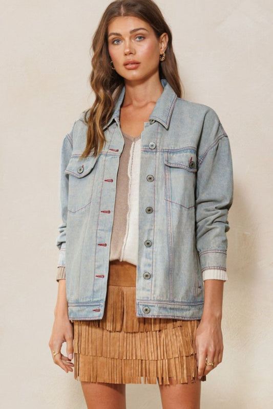 Acid Wash Lapel Collar Cropped Denim Jacket