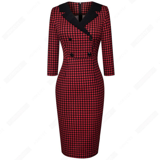 Vintage Classic Houndstooth Charming Fashion Chic Button V Neck Pencil Dress (BWM)(TP5)
