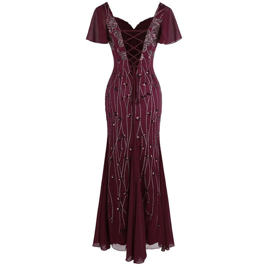 Fashion Women's Party Gown Cap Sleeves Dress - Queen Pattern Long Elegant Chiffon Evening Dress (1U30)(1U20)