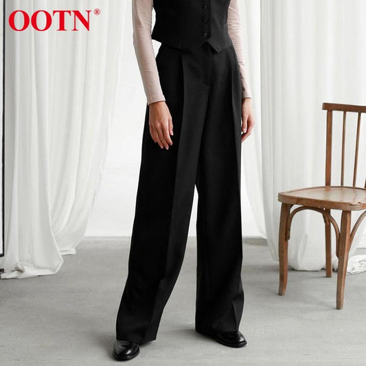 Cute Black Trouser Office Wear Wild High Waist Spring Pleated Elegant Straight Pants Plus Length -Pocket Basic Casual Women Pants (BP)(1U25)