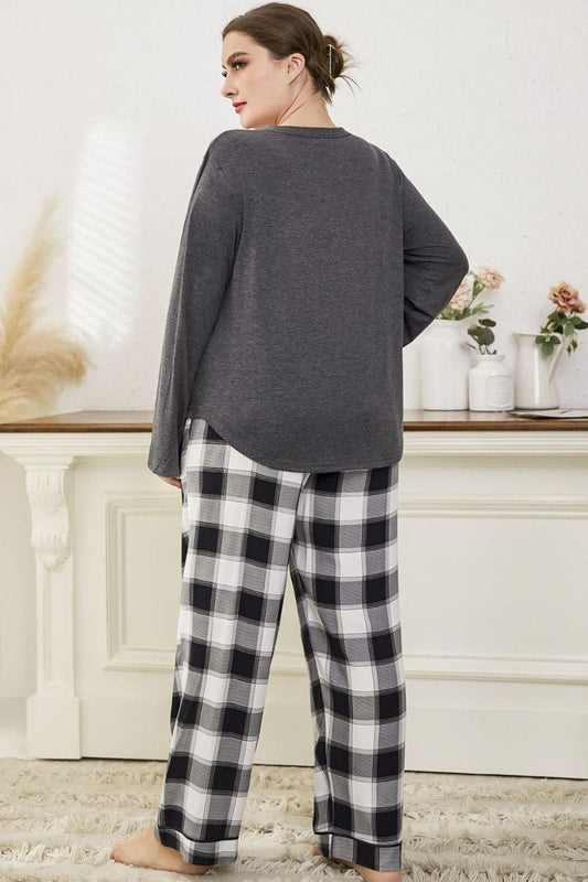 Plus Size Long Sleeve Top and Plaid Pants Lounge Set