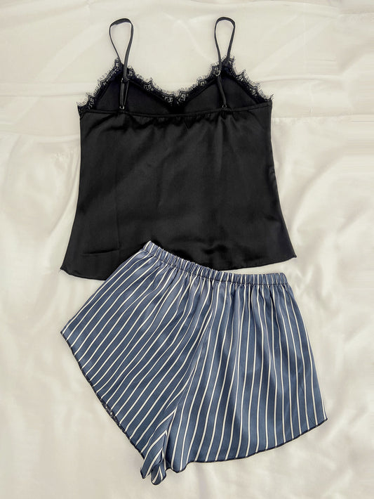 Lace Trim Spaghetti Strap Cami and Striped Shorts Pajama Set