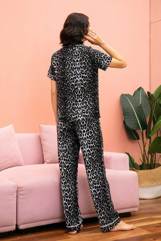 Leopard Lapel Collar Shirt and Pants Lounge Set
