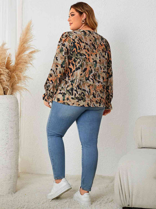 Plus Size Printed Tie Neck Balloon Sleeve Blouse