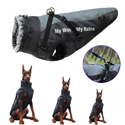 Waterproof Large Dog Clothes - Winter Dog Coat With Harness - Furry Collar Warm Pet Clothing (W1)(F69)
