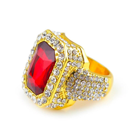 Men's Gold Color Hip Hop Iced Red Stone Cz Ring - Luxury Fashion Finger Bling Ring (MJ1)(F83)