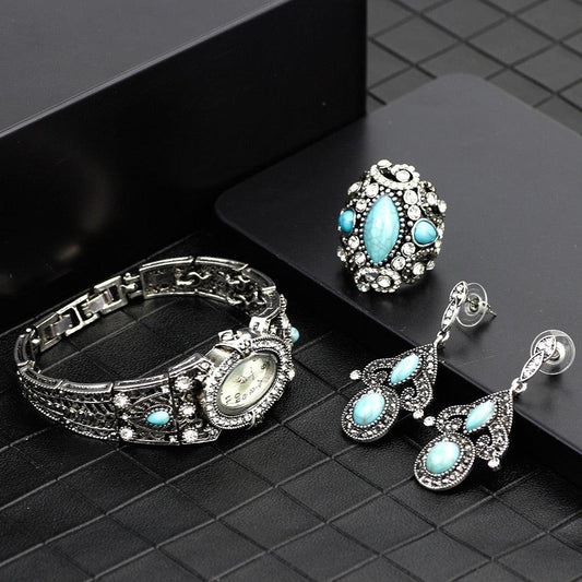Gorgeous Vintage Retro Silver Color Cuff Bracelet Watch, Ring, Drop Earring Blue Stone Jewelry Set (1JW)(F82)(F81)