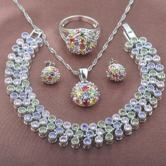 Gorgeous Women's Birthstone Jewelry Set - Multicolor Zirconia Silver Color (3JW)(4JW)(F81)