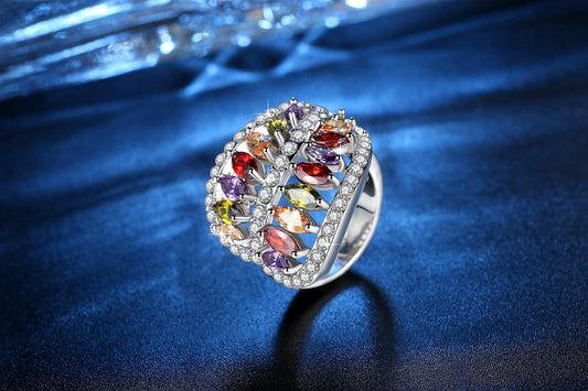 Fashion Luxury Rainbow Crystal Mixed Color Leaf Shaped Ring - Women Jewelry (7JW)(9JW)(F81)