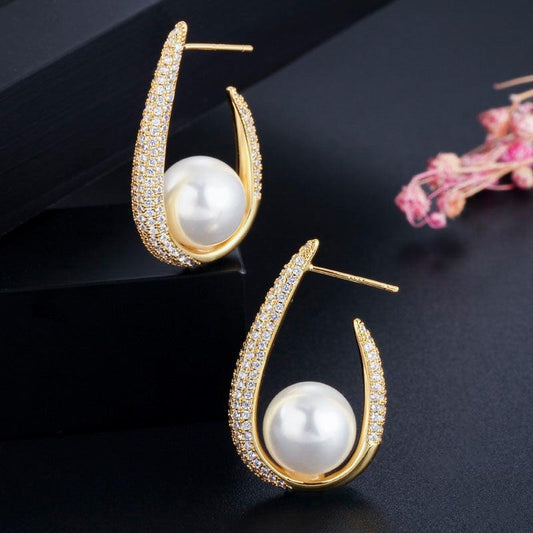 Beautiful Micro Pave Cubic Zirconia U Shape Yellow Gold Color Big Pearl Hoop Earrings (2JW3)(F81)