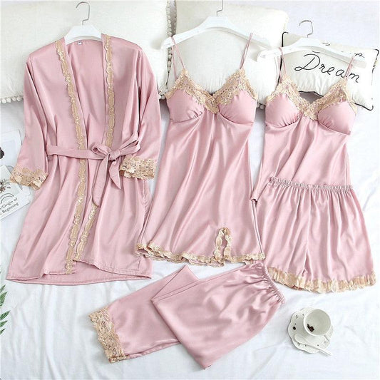 Amazing Women Sleepwear - With Chest Pads Sexy Women Pajamas Set- Lace Silk Sleep Lounge 5 Pieces Sets (ZP1)(F90)