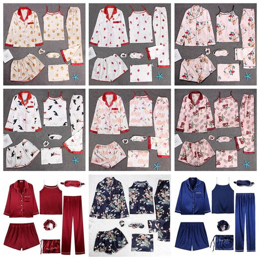 Amazing Sexy Spring Summer 7 Pieces Pajamas Sets - Women Silk Satin Pajama Soft Sleepwear (ZP1)(F90)