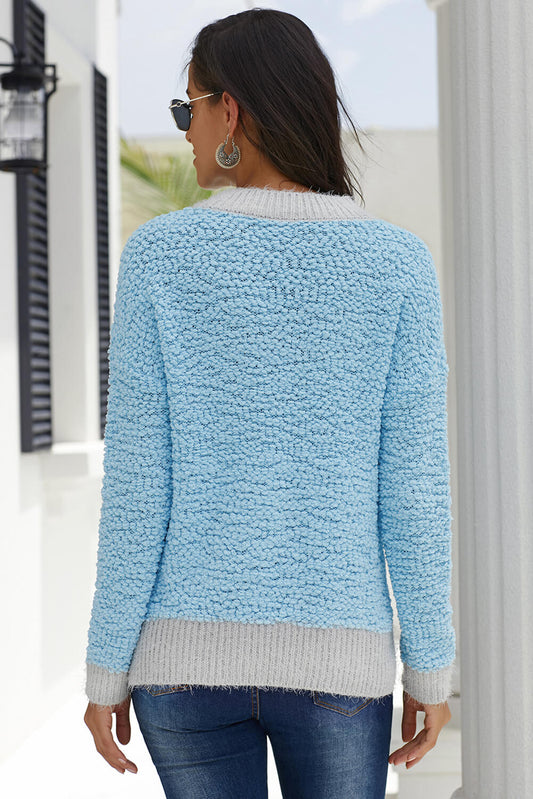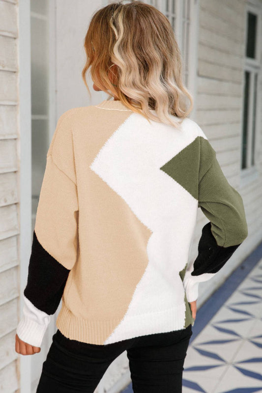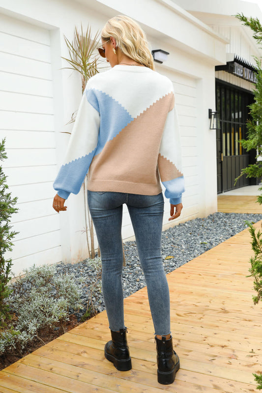 Tricolor Color Block Round Neck Ribbed Trim Sweater