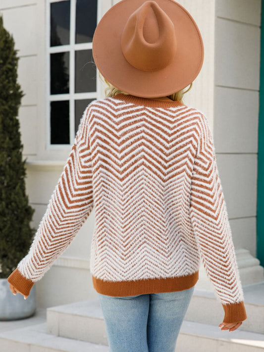 Striped Ribbed Round Neck Long Sleeve Sweater