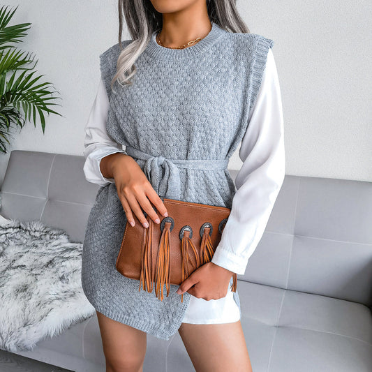 Tie-Waist Sleeveless Side Slit Sweater Vest