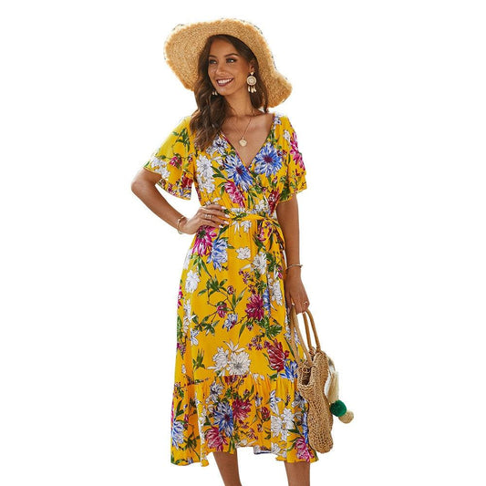 Trending Ladies Floral Printed Women Dress - A Line Deep Ruched V Neck Short Sleeve Midi Dress - Elegant Summer Dress (D30)(BWM)(WS06)
