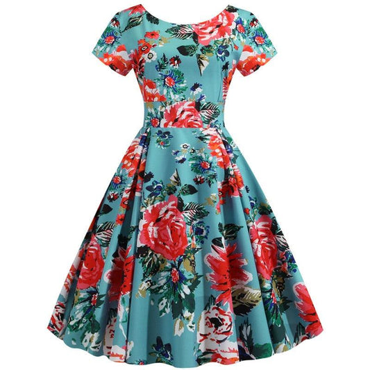 Summer Floral Print Elegant A-line Party Dress - Women Slim White Short Sleeve Swing Clothes - Plus Size Robe (D30)(BWM)