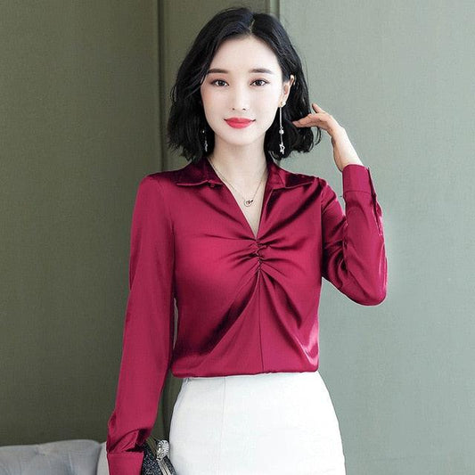 V-neck Artificial Silk Blouses - Women Wear Work Chiffon Shirts - Plus Size (D19)(TB1)(BCD2)
