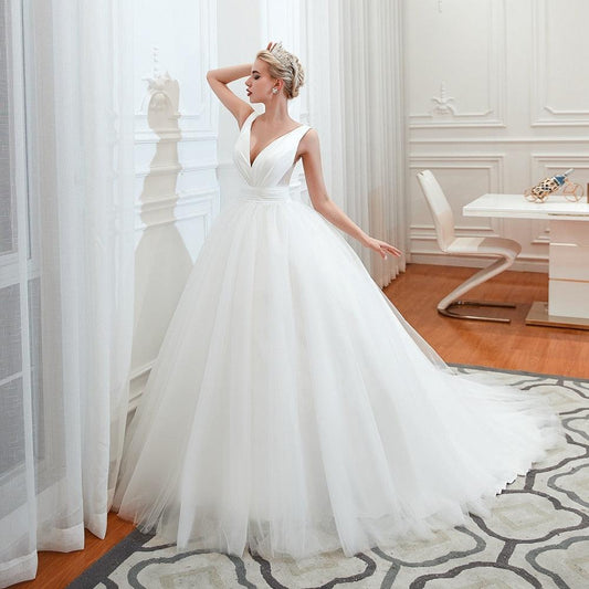 Great Wedding Dresses - Plus Size - Ball Gown Waistband - Deep V Neck Sleeveless Bride Gown (D18)(WSO1)