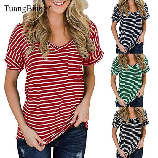 Summer Casual Women Striped T Shirts - Femme Short Sleeve Pockets Autumn Tops - Ladies V-Neck - Plus Size (D19)(TB2)