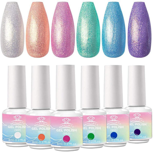 Gel Nail Soak Off Polish Set, Mermaid Atlantics Pink Pearl Holographic Gel Nail Polish 8ML Kit with 6 Colors Glimmer (D85)(N1)(N2)(1U85)