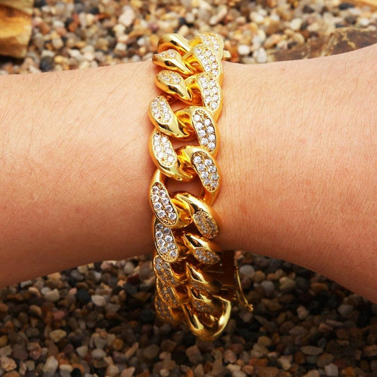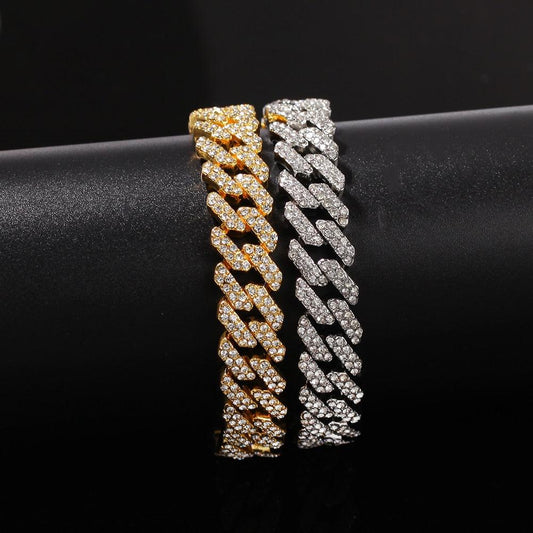 THE BLING KING 12mm Bling S-Link Miami Cuban Bracelets - Gold Color Full Iced Rhinestones (D83)(MJ3)