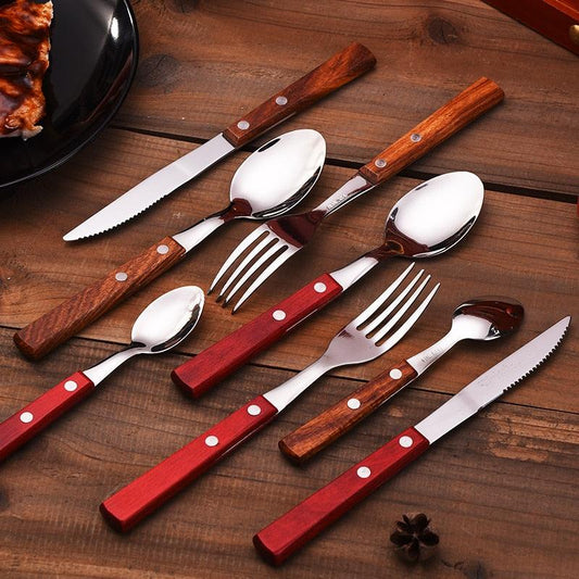 4PCS Tableware 304 Stainless Steel Tableware Western Food Dinner Home Solid Wood Handle Knife Fork Spoon Set (D61)(AK6)