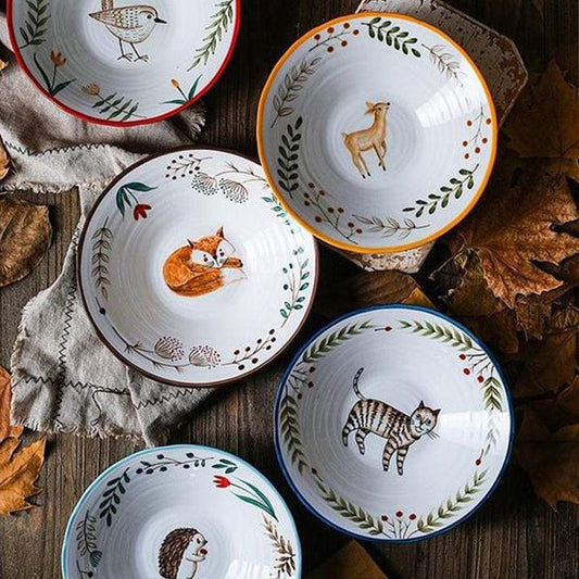 8 Inch Ceramic Ramen Bowl Hand-Painted Forest Animal Design - Anti-Hot Foam Bowls (D61)(AK7)